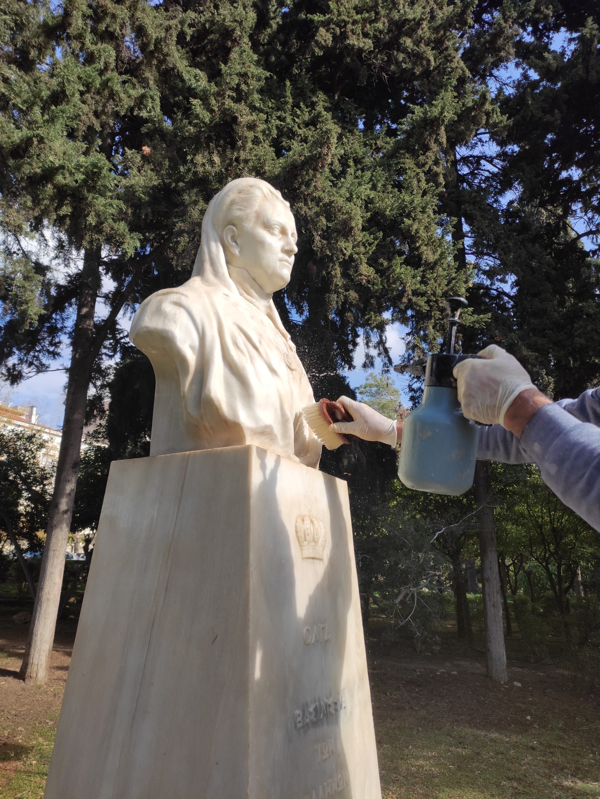 – Στον καθαρισμό από χρωστικές (γκράφιτι) και στην αποκατάσταση προστασίας με αντιγκράφιτι υλικό σε 5 γλυπτά (Πλάτωνας, Σήματα Δομών, Λορ. Μαβίλης, Π. Γύπαρης, Βασ. Όλγα), ενώ ξεκινά άμεσα ο καθαρισμός στο βάθρο του ανδριάντα του Θ. Κολοκοτρώνη, επί της οδού Σταδίου.