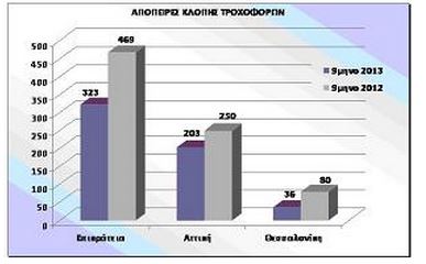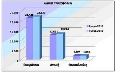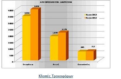 Το εννεάμηνο του 2013, σε επίπεδο επικράτειας, καθώς και στις περιοχές της Αττικής και Θεσσαλονίκης, όπου εμφανίζεται ο κύριος όγκος των κλοπών τροχοφόρων, στη σύγκριση με το περυσινό εννιάμηνο, καταγράφονται μειώσεις σε αυτή την κατηγορία, ως εξής: