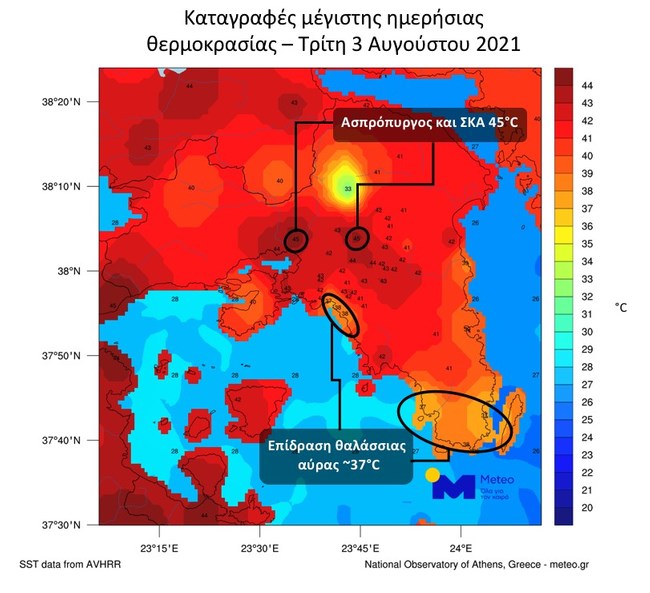 Αξιοσημείωτο είναι το γεγονός ότι η θερμοκρασία ξεπέρασε για δεύτερη συνεχόμενη ημέρα τους 46 βαθμούς Κελσίου στο δίκτυο αυτόματων μετεωρολογικών σταθμών του Εθνικού Αστεροσκοπείου Αθηνών/meteo.gr.