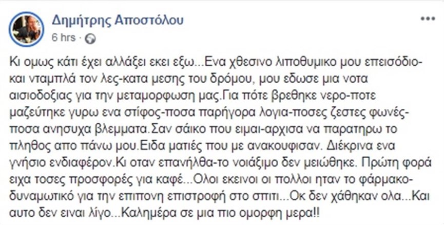 Ο Δημήτρης Αποστόλου είναι ένας από τους σεναριογράφους που έχει στο ενεργητικό του μεγάλες επιτυχίες τόσο στην τηλεόραση όσο και στο θέατρο. Ο ίδιος, μάλιστα, χρησιμοποιεί συχνά τα social media για να μοιραστεί προσωπικούς προβληματισμούς.Το Σάββατο 25 Μαΐου ο γνωστός σεναριογράφος λιποθύμησε στη μέση του δρόμου και περιέγραψε, μέσω των social media, την περιπέτεια του και εκεί διαπίστωσε ότι πολλοί άνθρωποι έσπευσαν να τον βοηθήσουν και να του προσφέρουν νερό. Δείτε τι έγραψε: «Κι όμως κάτι έχει αλλάξει εκεί έξω. Ένα χθεσινό λιποθυμικό μου επεισόδιο -και νταμπλά τον λες- κατά μεσής του δρόμου, μου έδωσε μια νότα αισιοδοξίας για την μεταμόρφωση μας. Για πότε βρέθηκε νερό, πότε μαζεύτηκε γύρω ένα στίφος, πόσα παρήγορα λόγια, πόσες ζεστές φωνές, πόσα ανήσυχα βλέμματα. Σαν σάικο που είμαι, άρχισα να παρατηρώ το πλήθος από πάνω μου. Είδα ματιές που με ανακούφισαν. Διέκρινα ένα γνήσιο ενδιαφέρον. Κι όταν επανήλθα, το νοιάξιμο δεν μειώθηκε. Πρώτη φορά είχα τόσες προσφορές για καφέ. Όλοι εκείνοι οι πολλοί ήταν το φάρμακο. Δυναμωτικό για την επίπονη επιστροφή στο σπίτι. Οκ, δεν χάθηκαν όλα. Και αυτό δεν είναι λίγο… Καλημέρα σε μια πιο όμορφη μέρα!», έγραψε στο μήνυμά του.