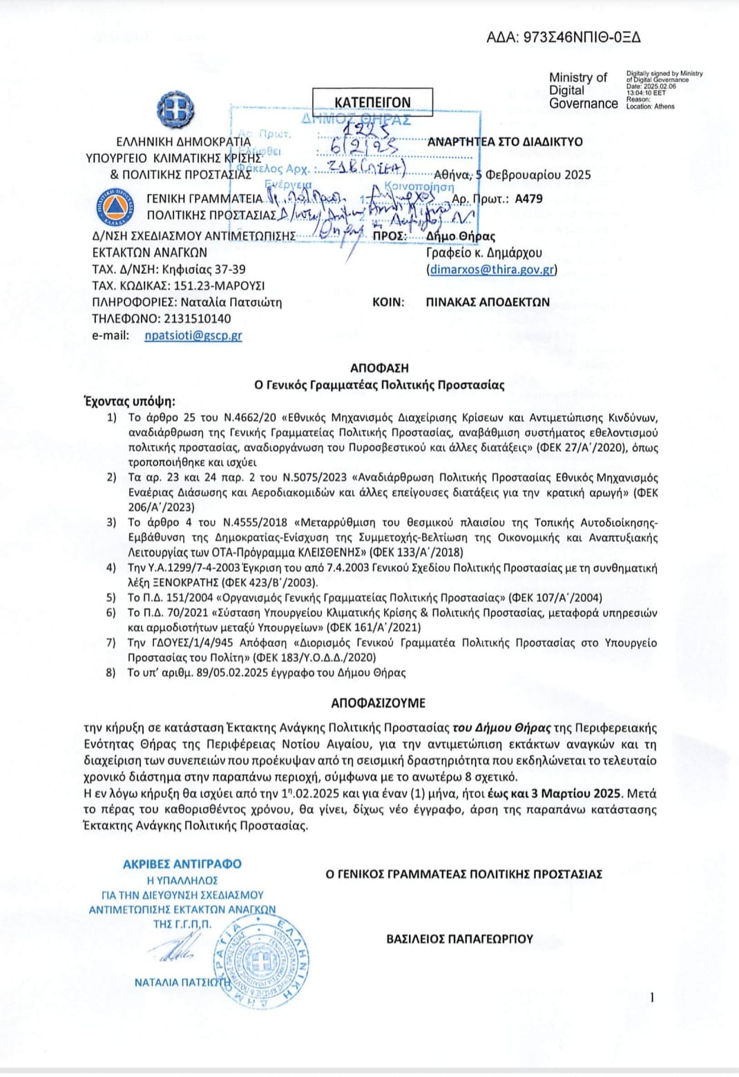 Σύμφωνα με την σχετική απόφαση, ο δήμος Θήρας κηρύχθηκε σε κατάσταση έκτακτης ανάγκης Πολιτικής Προστασίας για την αντιμετώπιση έκτακτων αναγκών και τη διαχείριση των συνεπειών που προέκυψαν από τη σεισμική δραστηριότητα που εκδηλώνεται το τελευταίο χρονικό διάστημα στην παραπάνω περιοχή.