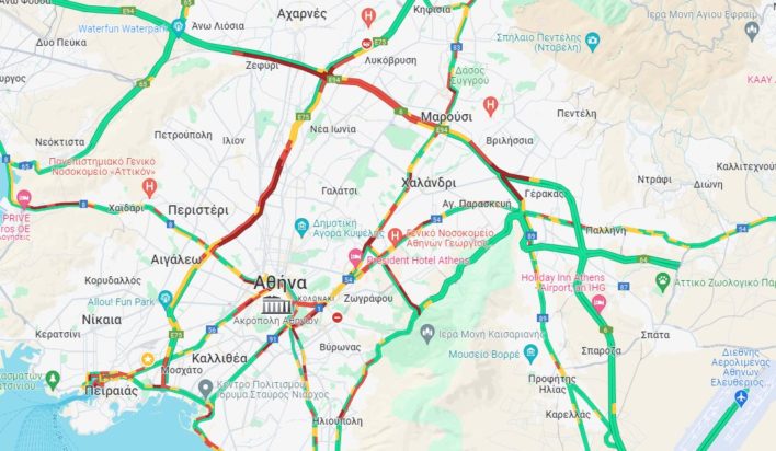 «Γολγοθάς» οι μετακινήσεις στους δρόμους της Αττικής. Η κίνηση «χτυπά κόκκινο» στα δύο ρεύματα της Εθνικής Οδού Αθηνών- Λαμίας, στην έξοδο της Αθηνών- Κορίνθου και στην κάθοδο του Κηφισού μέχρι την Πέτρου Ράλλη.