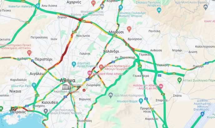 10΄-15΄ από κόμβο Πλακεντίας μέχρι κόμβο Κηφισίας.