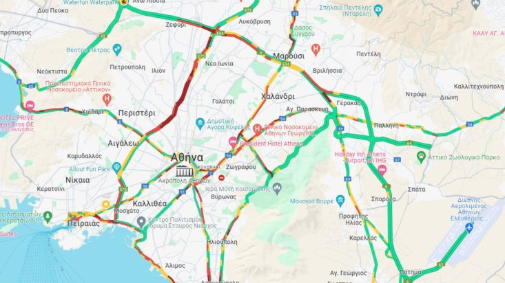 Η κίνηση «κόβει βόλτες» στους δρόμους της Αττικής. Στο «κόκκινο» βρίσκονται και τα δύο ρεύματα του Κηφισού, αλλά και στην έξοδο της Εθνικής Οδού Αθηνών – Κορίνθου.