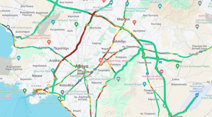 «Ακίνητα» είναι τα οχήματα και στα δύο ρεύματα του Κηφισού, ενώ σημειωτόν κινούνται οι οδηγοί στην Κατεχάκη στο ρεύμα από Ηλιούπολη και στα δύο ρεύματα της Λεωφόρου Κηφισίας.