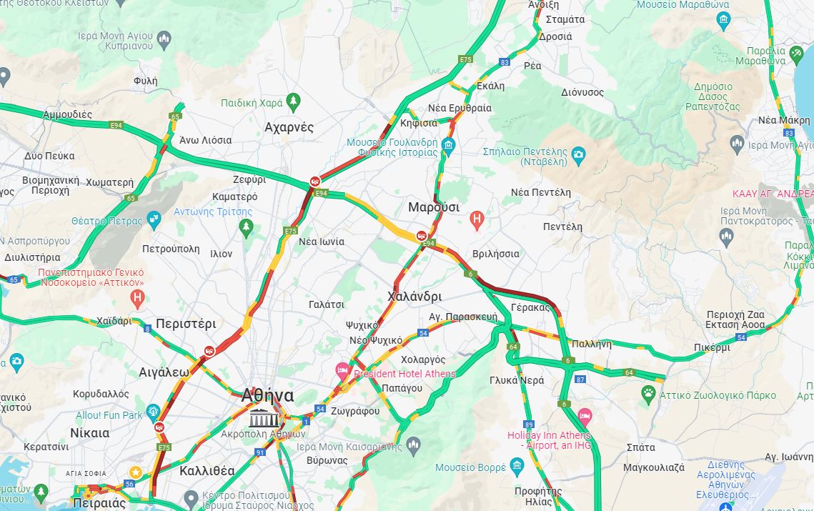 Προβλήματα αντιμετωπίζουν και οι οδηγοί που κινούνται στην άνοδο της Λ. Κηφισίας, κυρίως στο ύψος του Αμαρουσίου. Με χαμηλές ταχύτητες κινούνται τα οχήματα και στην Λ. Ποσειδώνος, στο ρεύμα προς Πειραιά.