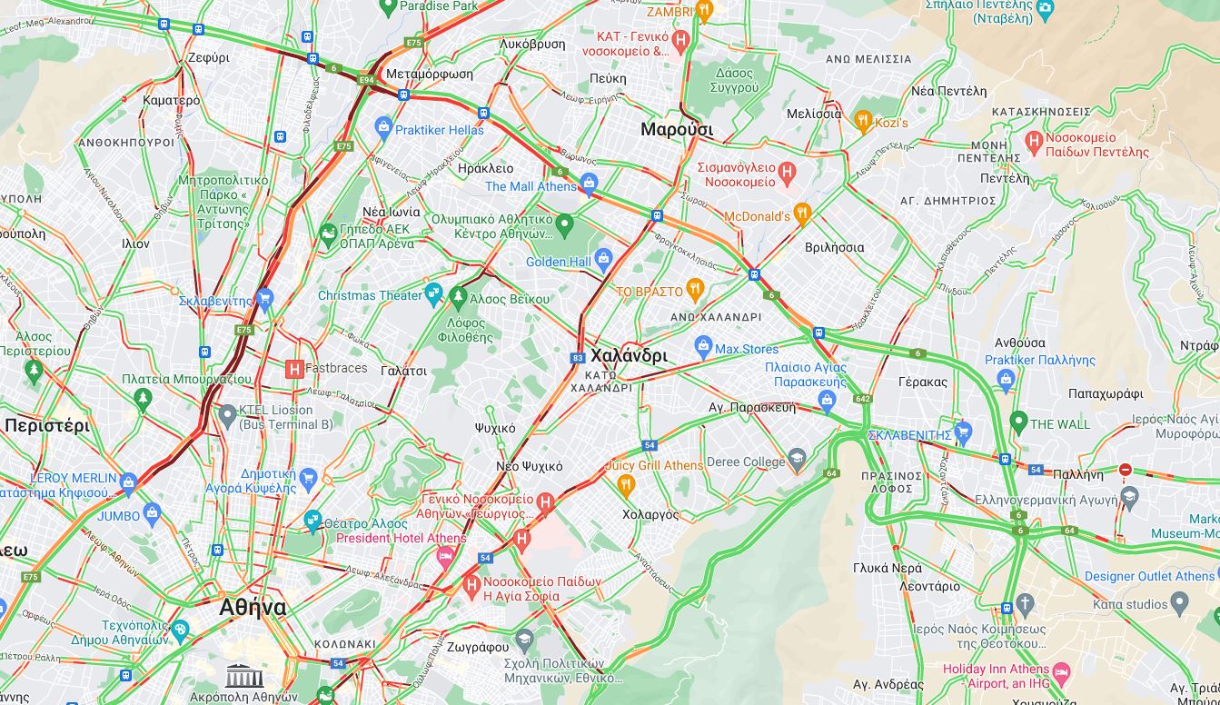 Αυξημένη είναι η κίνηση στο μεγαλύτερο μέρος της Κηφισίας, στην λεωφόρο Μεσογείων από το ύψος του Χολαργού προς το κέντρο, στην Παπανικολή στο Χαλάνδρι, στην Καποδιστρίου, στην Αλεξάνδρας και σε πολλούς δρόμους στο κέντρο της Αθήνας.
