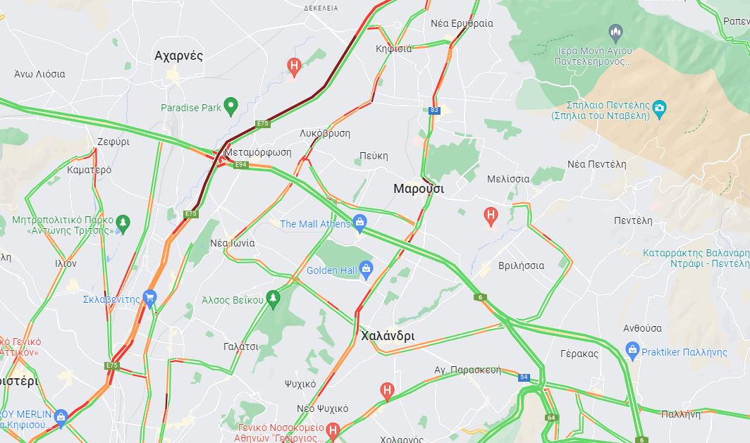 Όπως φαίνεται στον παρακάτω χάρτη, το μοναδικό σημείο που επικρατεί μεγάλο μποτιλιάρισμα είναι στην κάθοδο του Κηφισού, από το ύψος της Κηφισιάς έως την Νέα Ιωνία. Στη συνέχεια η κυκλοφορία διεξάγεται χωρίς μεγάλες καθυστερήσεις.