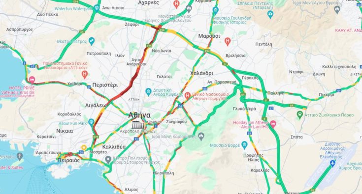 «Κόκκινο» χτυπά η κίνηση και στα δύο ρεύματα της Αθηνών – Λαμίας αλλά και στην έξοδο της Εθνικής Οδού Αθηνών – Κορίνθου από το Χαϊδάρι.