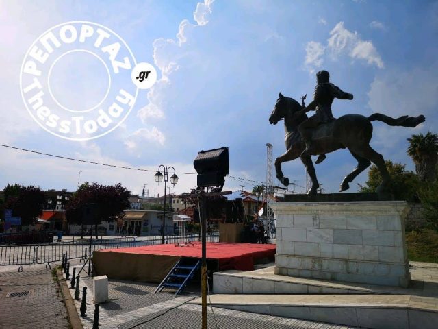 Πολλοί κάτοικοι της περιοχής έχουν κρεμάσει ελληνικές σημαίες στα μπαλκόνια τους ενώ στο χώρο της εξέδρας που έχει στηθεί ήδη ακούγονται τραγούδια για την Μακεδονία.