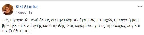 Τέλος έλαβε η περιπέτεια της 46χρονης Ευαγγελίας Σκόδρα που είχε εξαφανιστεί από την Αγία Παρασκευή την Κυριακή.