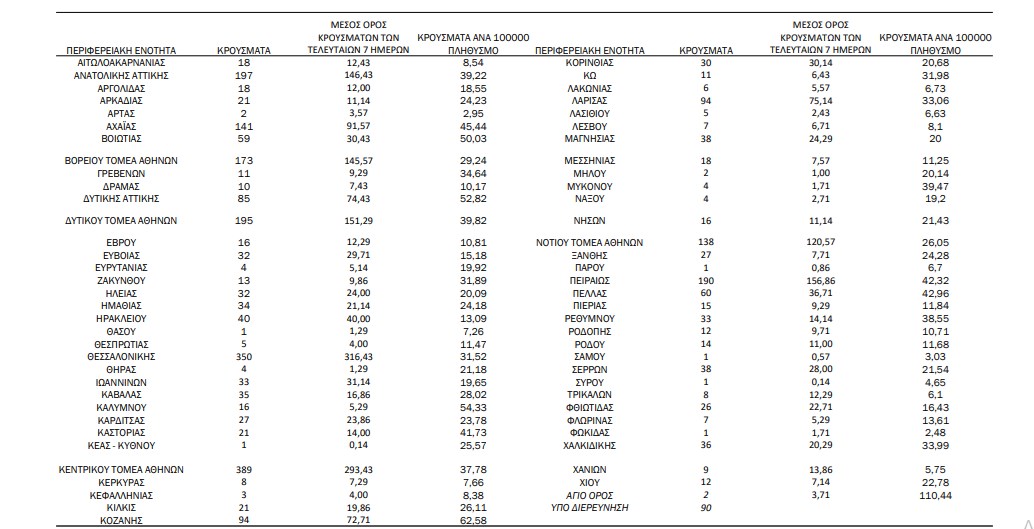Προβληματική είναι η κατάσταση στη Βοιωτία με 59 κρούσματα, στην Εύβοια με 32, στην Ηλεία με 32, στην Ημαθία με 34, στην Κάλυμνο με 16, στην Καρδίτσα με 27, στην Καστοριά 21, στην Κοζάνη με 94, στην Κόρινθο με 30, στη Λάρισα με 94, στη Μαγνησία με 38, στην Πέλλα με 60, στο Ρέθυμνο με 33, στις Σέρρες με 38 και στη Χαλκιδική με 36.
