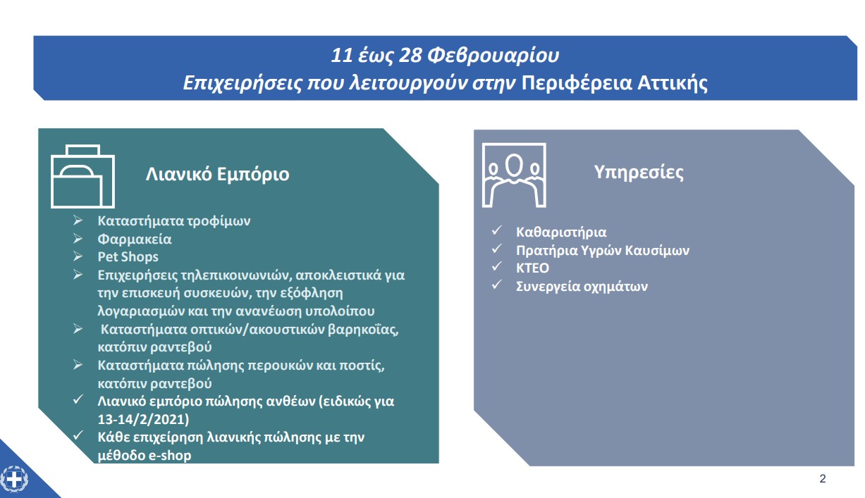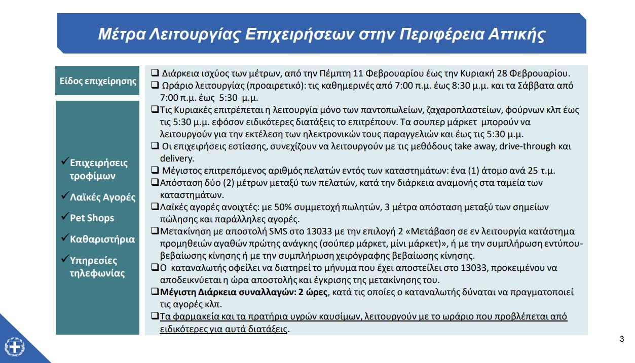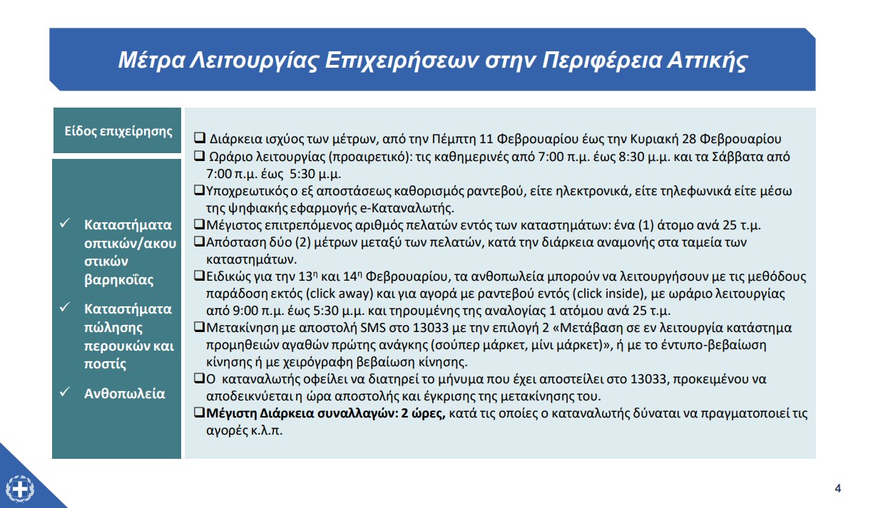 – Τις Κυριακές επιτρέπεται η λειτουργία μόνο των παντοπωλείων, ζαχαροπλαστείων, φούρνων κλπ έως τις 5:30 μ.μ. εφόσον ειδικότερες διατάξεις το επιτρέπουν. Τα σούπερ μάρκετ μπορούν να λειτουργούν για την εκτέλεση των ηλεκτρονικών τους παραγγελιών και έως τις 5:30 μ.μ. Αυτό το Σαββατοκύριακο (13/14 Φεβρουαρίου) θα είναι ανοιχτά τα ανθοπωλεία που θα λειτουργήσουν με click away και click inside.