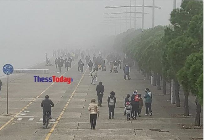Αρκετός κόσμος βρίσκεται αυτή τη στιγμή στο ομιχλώδες παραλιακό μέτωπο της Θεσσαλονίκης, απολαμβάνοντας τη μεσημεριανή βόλτα το Σάββατο. Άνθρωποι όλων των ηλικιών περπατούν, τρέχουν ή κάνουν ποδήλατο στο κομμάτι του παραλιακού μετώπου, από το λιμάνι έως το Μέγαρο Μουσικής.