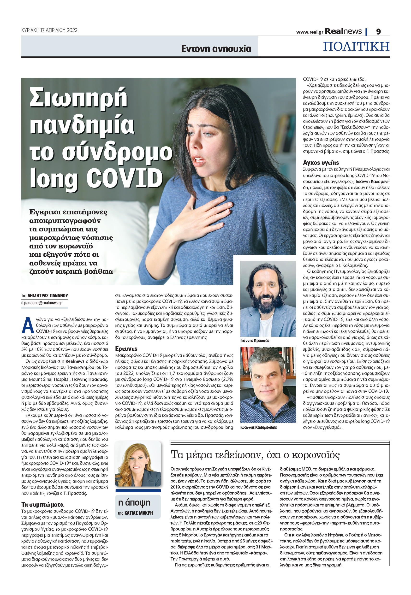 «Χρειαζόμαστε ειδικούς δείκτες που να μπορούν να χρησιμοποιηθούν για την έγκαιρη και έγκυρη διάγνωση του συνδρόμου. Πρέπει να καταλάβουμε τη συσχέτισή του με τα σύνδρομα μακροχρόνιων διαταραχών που προκαλούν και άλλοι ιοί (π.χ. γρίπη, έμπολα). Ολα αυτά θα αποτελέσουν τη βάση για τον σχεδιασμό νέων θεραπειών, που θα ‘‘ξεκλειδώσουν’’ την παθολογία αυτών των ασθενών και θα τους επιτρέψουν να επιστρέψουν στην ομαλή λειτουργία τους. Ηδη προς αυτή την κατεύθυνση γίνονται σημαντικά βήματα», σημειώνει ο Γ. Πρασσάς.