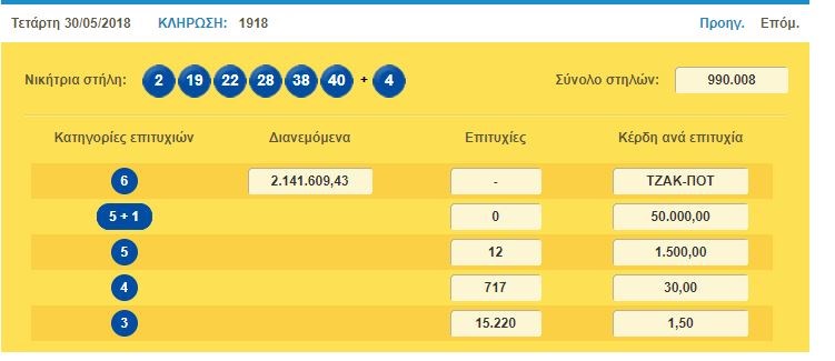 Το ποσό των 2,2 εκατομμυρίων ευρώ θα μοιραστούν οι τυχεροί της 1ης κατηγορίας στην κλήρωση του Σαββάτου στο ΛΟΤΤΟ μετά το ΤΖΑΚ ΠΟΤ που σημειώθηκε στην κλήρωση της Τετάρτης. Οι τυχεροί αριθμοί: