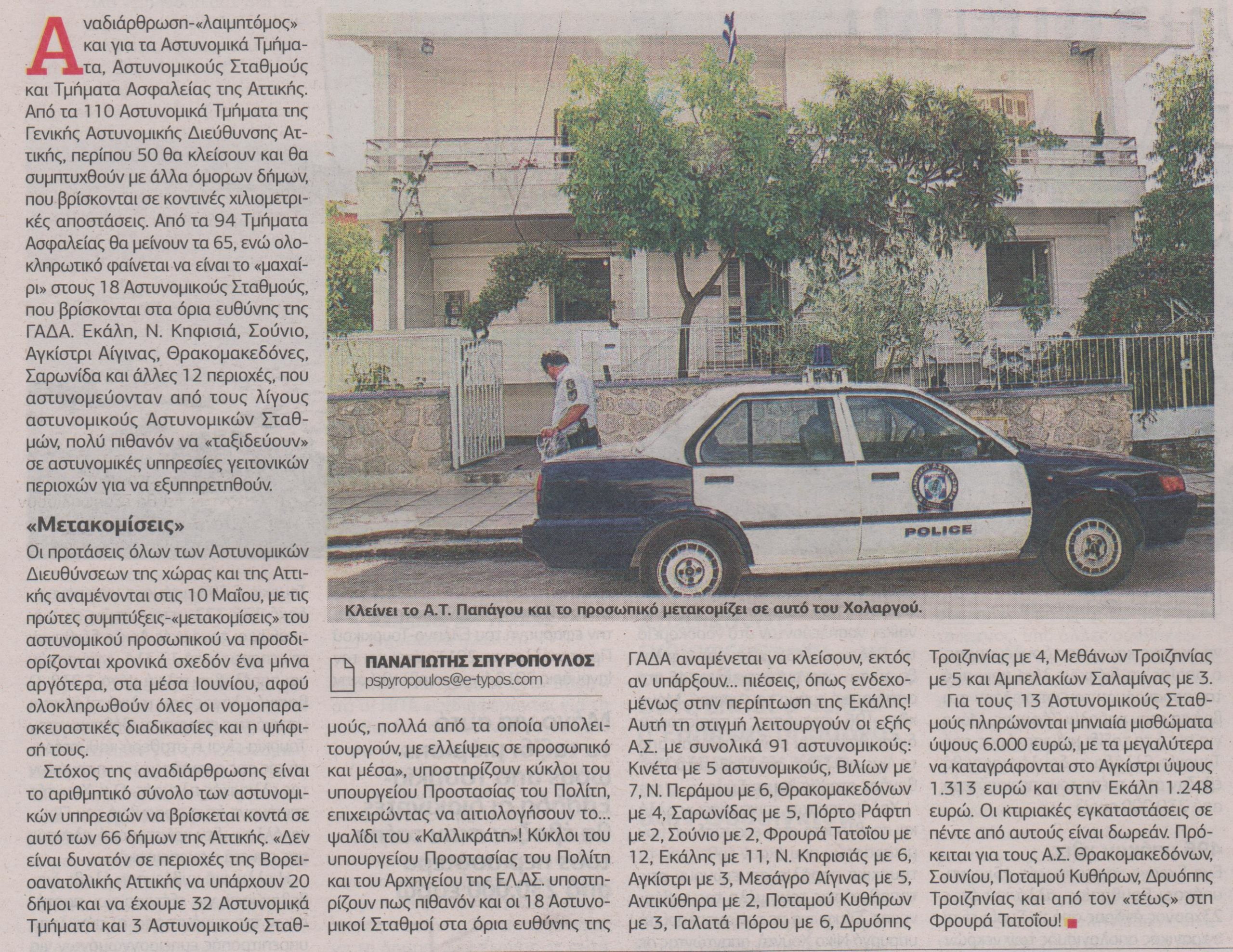 Αναδιάρθρωση – «λαιμητόμος» και για τα Αστυνομικά Τμήματα, Αστυνομικούς Σταθμούς και Τμήματα Ασφαλείας της Αττικής. Από τα 110 Αστυνομικά Τμήματα της Γενικής Αστυνομικής Διεύθυνσης Αττικής, περίπου 50 θα κλείσουν και θα συμπτυχθούν με άλλα όμορων δήμων, που βρίσκονται σε κοντινές χιλιομετρικές αποστάσεις.