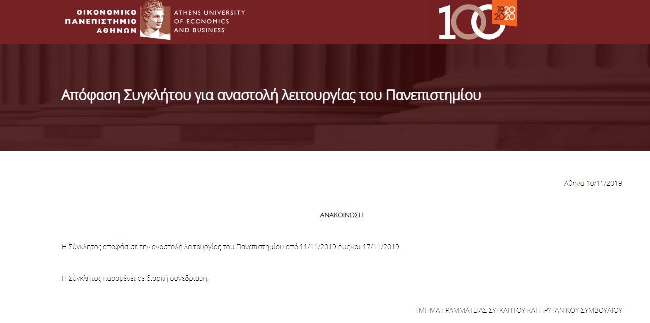 Σε έκτακτη συνεδρίασή της η Σύγκλητος του Οικονομικού Πανεπιστημίου Αθηνών – πρώην ΑΣΟΕΕ – αποφάσισε την αναστολή λειτουργίας του Πανεπιστημίου από 11/11 έως και 17/11 ενώ η Σύγκλητος παραμένει σε διαρκή συνεδρίαση.