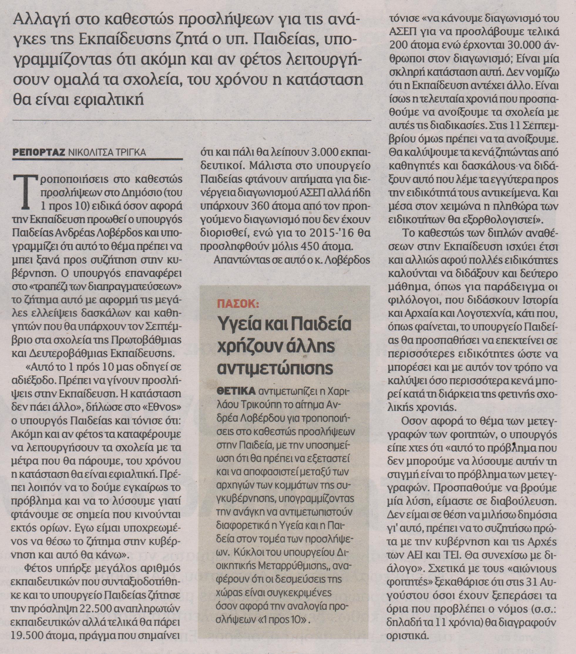 Τροποποιήσεις στο καθεστώς προσλήψεων στο Δημόσιο (του 1 προς 10) ειδικά όσον αφορά στην Εκπαίδευση προωθεί ο υπουργός Παιδείας, Ανδρέας Λοβέρδος και υπογραμμίζει ότι αυτό το θέμα πρέπει να μπει ξανά προς συζήτηση στην κυβέρνηση.