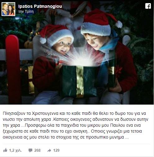 Πλησιάζουν τα Χριστούγεννα και το κάθε παιδί θα θέλει το δώρου του για να νιώσει την απόλυτη χαρά. Κάποιες οικογένειες αδυνατούν να δώσουν αυτή τη χαρά …Προσφέρω όλα τα παιχνίδια του μικρού μου Παύλου για ένα ένα ξεχωριστά σε κάθε παιδί που το έχει ανάγκη..Όποιος γνωρίζει μια τέτοια οικογένεια ας μου στείλει τα στοιχεία της σε προσωπικό μήνυμα”.