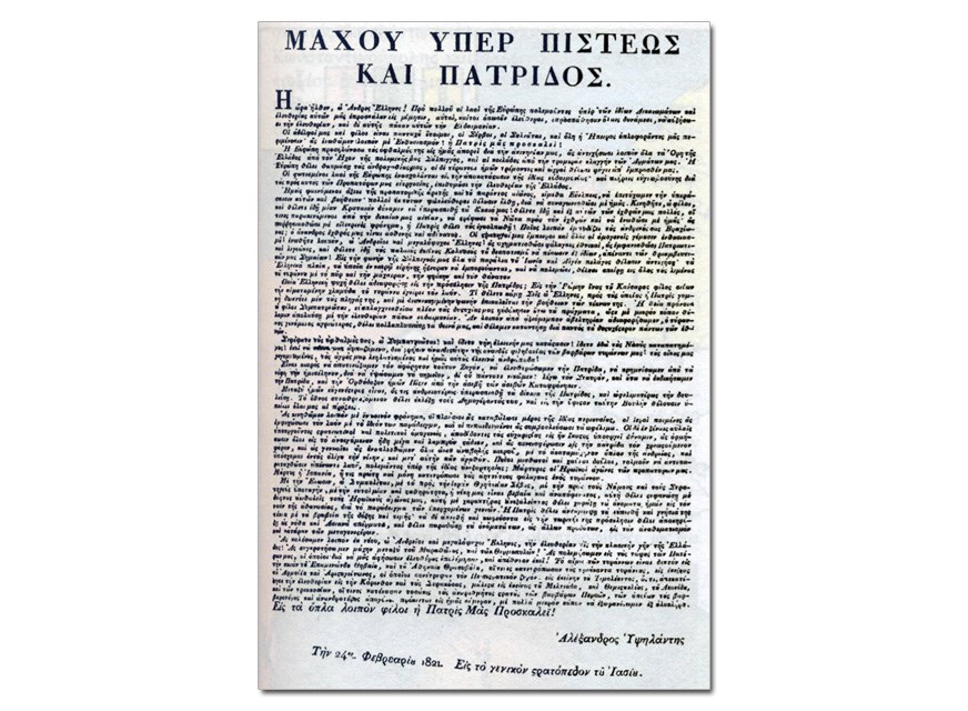 Η ώρα ήλθεν, ω Άνδρες Έλληνες! Προ πολλού οι λαοί της Ευρώπης, πολεμούντες υπέρ των ιδίων Δικαιωμάτων και ελευθερίας αυτών, μας επροσκάλουν εις μίμησιν, αυτοί, καίτοι οπωσούν ελεύθεροι, επροσπάθησαν όλαις δυνάμεσι να αυξήσωσι την ελευθερίαν, και δι’ αυτής πάσαν αυτών την Ευδαιμονίαν.Οι αδελφοί μας και φίλοι είναι πανταχού έτοιμοι, οι Σέρβοι, οι Σουλιώται, και όλη η Ηπειρος, οπλοφορούντες μας περιμένωσιν· ας ενωθώμεν λοιπόν με Ενθουσιασμόν! η Π α τ ρ ί ς μ α ς π ρ ο σ κ α λ ε ί!Η Ευρώπη, προσηλώνουσα τους οφθαλμούς της εις ημάς, απορεί διά την ακινησίαν μας, ας αντηχήσωσι λοιπόν όλα τα Όρη τής Ελλάδος από τον Ήχον τής πολεμικής μας Σάλπιγγος, και αι κοιλάδες από την τρομεράν κλαγγήν των Αρμάτων μας. Η Ευρώπη θέλει θαυμάση τας ανδραγαθίας μας, οι δε τύραννοι ημών τρέμοντες και ωχροί θέλουσι φύγει απ’ έμπροσθέν μας.Οι φωτισμένοι λαοί της Ευρώπης ενασχολούνται εις την αποκατάστασιν της ιδίας ευδαιμονίας· και πλήρεις ευγνωμοσύνης διά τας προς αυτούς των Προπατόρων μας ευεργεσίας, επιθυμούσι την ελευθερίαν της Ελλάδος.Ημείς, φαινόμενοι άξιοι της προπατορικής αρετής και του παρόντος αιώνος, είμεθα Εύελπεις, να επιτύχωμεν την υπεράσπισιν αυτών και βοήθειαν· πολλοί εκ τούτων φιλελεύθεροι θέλουσιν έλθη, διά να συναγωνισθώσι με ημάς. Κινηθήτε, ω φίλοι, και θέλετε ιδή μίαν Κραταιάν δύναμιν να υπερασπισθή τα δίκαιά μας! Θέλετε ιδή και εξ αυτών των εχθρών μας πολλούς, οίτινες, παρακινούμενοι από την δικαίαν μας αιτίαν, να στρέψωσι τα Νώτα προς τον εχθρόν και να ενωθώσι με ημάς· ας παρρησιασθώσι με ειλικρινές φρόνημα, η Πατρίς θέλει τους εγκολπωθή! Ποίος λοιπόν εμποδίζει τους ανδρικούς σας Βραχίονας; ο άνανδρος εχθρός μας είναι ασθενής και αδύνατος. Οι στρατηγοί μας έμπειροι και όλοι οι ομογενείς γέμουσιν ενθουσιασμού! ενωθήτε λοιπόν, ω ανδρείοι και μεγαλόψυχοι Έλληνες! ας σχηματισθώσι φάλαγκες εθνικαί, ας εμφανισθώσι Πατριωτικαί λεγεώνες, και θέλετε ιδή τους παλαιούς εκείνους Κολοσσούς του δεσποτισμού να πέσωσιν εξ ιδίων, απέναντι των θριαμβευτικών μας Σημαίων! Εις την φωνήν της Σάλπιγκός μας όλα τα παράλια του Ιωνίου και Αιγέου πελάγους θέλουσιν αντηχήση· τα Ελληνικά πλοία, τα οποία εν καιρώ ειρήνης ήξεραν να εμπορεύωνται, και να πολεμώσι, θέλουσι σπείρη εις όλους τους λιμένας του τυράννου με το πυρ και την μάχαιραν, την φρίκην και τον θάνατον…Ποία ελληνική ψυχή θέλει αδιαφορήση εις την πρόσκλησιν της Πατρίδος; Εις την Ρώμην ένας του Καίσαρος φίλος σείων την αιματομένην χλαμύδα του τυράννου εγείρει τον λαόν. Tι θέλετε κάμη Σεις ω Έλληνες, προς τους οποίους η Πατρίς γυμνή δεικνύει μεν τας πληγάς της και με διακεκομμένην φωνήν επικαλείται την βοήθειαν των τέκνων της; Η θεία πρόνοια, ω φίλοι Συμπατριώται, ευσπλαγχνισθείσα πλέον τας δυστυχίας μας ηυδόκησεν ούτω τα πράγματα, ώστε με μικρόν κόπον θέλομεν απολαύση με την ελευθερίαν πάσαν ευδαιμονίαν. Αν λοιπόν από αξιόμεμπον αβελτηρίαν αδιαφορήσωμεν, ο τύραννος γενόμενος αγριώτερος θέλει πολλαπλασιάση τα δεινά μας, και θέλομεν καταντήση διά παντός το δυστυχέστερον πάντων των εθνών.Στρέψατε τους οφθαλμούς σας, ω Συμπατριώται, και ίδετε την ελεεινήν μας κατάστασιν! ίδετε εδώ τους Ναούς καταπατημένους! εκεί τα τέκνα μας αρπαζόμενα διά χρήσιν αναιδεστάτην της αναιδούς φιληδονίας των βαρβάρων τυράννων μας! τους οίκους μας γεγυμνωμένους, τον αγρούς μας λεηλατισμένους και ημάς αυτούς ελεεινά ανδράποδ