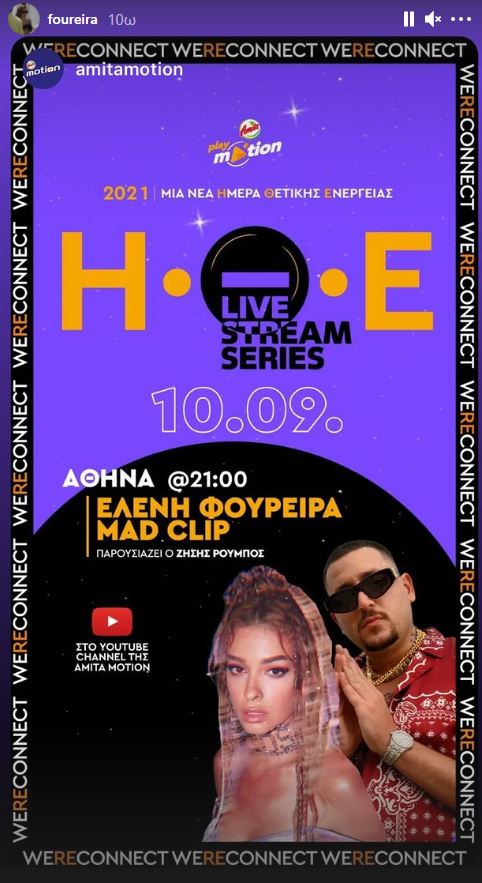 Η Ελένη Φουρέιρα και ο Mad Clip είχαν πρόσφατα κάνει πολύ μεγάλη επιτυχία με το τραγούδι “Μπορεί”.Φουρέιρα και Mad Clip επρόκειτο να κάνουν κοινή εμφάνιση στις 10 Σεπτεμβρίου, στο πλαίσιο της Ημέρας Θετικής Ενέργειας με την Ελένη Φουρέιρα να κάνει την παρακάτω ανάρτηση στον λογαριασμό της στο Instagram. Το συγκεκριμένο instastory ανέβηκε μόλις λίγες ώρες προτού ο Mad Clip φύγει από τη ζωή.