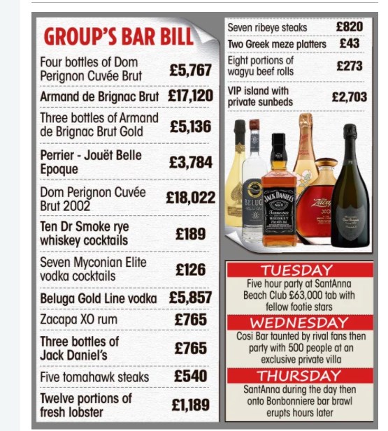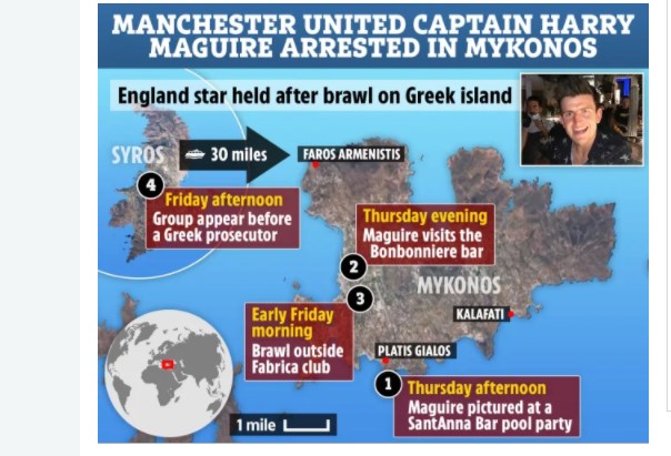 Ο αρχηγός της Μάντσεστερ Γιουνάιτεντ, Χάρι Μαγκουάιρ πέρασε νύχτες ξέφρενης διασκέδασης, όπως αναφέρει η Dailymail, πριν από τη σύλληψη του στη Μύκονο. Όπως αναφέρει το δημοσίευμα ο ποδοσφαιριστής για πέντε περίπου ώρες έπινε. Η πλευρά του ποδοσφαιριστή υποστηρίζει ότι η αδελφή του δέχθηκε επίθεση από τους Βρετανούς, οι οποίοι την χαράκωσαν στο μπράτσο. Ο Μαγκουάιρ προσγειώθηκε με αεροπλάνο στη Μύκονο μετά τον αποκλεισμό της ομάδας του από την Σεβίλλη. Ο ποδοσφαιριστής επισκέφθηκε αρκετά μπαρ και κλαμπ με την παρέα του και τους συγγενείς του από την ημέρα που έφθασε στο νησί. Αυτόπτες μάρτυρες αναφέρουν ότι είδαν τον Μαγκουάιρ να ξοδεύει χιλιάδες ευρώ για σαμπάνιες και άλλα πολυτελή ποτά όπως επίσης και για αστακούς πριν ξεσπάσει ο καβγάς. Όπως αναφέρει η Sun, την Τρίτη ο ποδοσφαιριστής και η παρέα του ξόδεψε 70.000 ευρώ, 69.914 ευρώ για την ακρίβεια, σε ποτά και φαγητά. Στην παρέα ήταν και ο ποδοσφαιριστής Ρος Μπάρκλεϊ. Κατανάλωσαν vintage μπουκάλια σαμπάνιας, κοκτέιλ και άλλα ποτά σε γνωστό μπιτς μπαρ. Κατανάλωσαν μια σαμπάνια Dom Perignon Brut 2002, αξίας 20.000 ευρώ, ένα μπουκάλι Armand de Brignac Champagne, αξίας 18.500 ευρώ και μερικά μπουκάλια ουίσκι αξίας 830 ευρώ. Φυσικά για να καλύψουν και την πείνα τους κατανάλωσαν αστακούς αξίας 1.300 ευρώ και επτά ribeye αξίας 820 ευρώ. Η παρέα διασκέδασε στην VIP περιοχή του μαγαζιού και τους κόστισε περίπου 2.200 ευρώ. Το επόμενο απόγευμα η βραδιά πήρε την περίεργη τροπή με τον Μαγκουάιρ να καταλήγει στο κελί του ΑΤ Μυκόνου. Την επόμενη βραδιά δέχθηκε μια φραστική επίθεση από την παρέα των Βρετανών, αλλά δεν δόθηκε έκταση. Στη συνέχεια ο ποδοσφαιριστής παρευρέθηκε σε πάρτι σε ιδιωτική βίλα Έλληνα επιχειρηματία, όπως αναφέρει η βρετανική εφημερίδα, και αποχώρησε όταν οι αστυνομικοί επενέβησαν στις 4:15 το πρωί για να διαλύσουν το πάρτι. Ένας από τους παρευρισκόμενους ανέφερε ότι “ο Χάρι ήταν εκεί, κατάφερε να φύγει πριν φτάσει η αστυνομία. Διασκέδαζε με μια παρέα φίλων και δεν συμπεριφέρθηκε άσχημα”. Την επόμενη ημέρα η παρέα του Μαγκουάιρ επέστρεψε στο δημοφιλές μπιτς μπαρ. Την Πέμπτη τ βράδυ, πηγές υποστηρίζουν ότι ο Μαγκουάιρ “έπεσε” πάνω στους ίδιους Βρετανούς που τον είχαν βρίσει, αλλά αυτή τη φορά η κατάσταση ξέφυγε από τον έλεγχο.