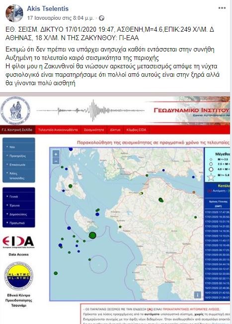 Νωρίτερα, ο διευθυντής του Γεωδυναμικού Ινστιτούτου είχε γράψει στο Facebook ότι ορισμένοι διαγράφηκαν από τη λίστα των φίλων του, όχι σκόπιμα, αλλά εξαιτίας ενός λογισμικού που έχει εγκαταστήσει. “Φυσικά εννοείται ότι δίνω πάντα προτεραιότητα στους συμπατριώτες μου Κεφαλονίτες…”, προσθέτει ο Άκης Τσελέντης.