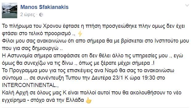 Μεταξύ άλλων ο Μανώλης Σφακιανάκης, που έχει συνδέσει το όνομα του με τη Δίωξη Ηλεκτρονικού Εγκλήματος, έγραψε: «Η Αστυνομία σήμερα αποφάσισε οτι δεν θέλει άλλο τις υπηρεσίες μου».
