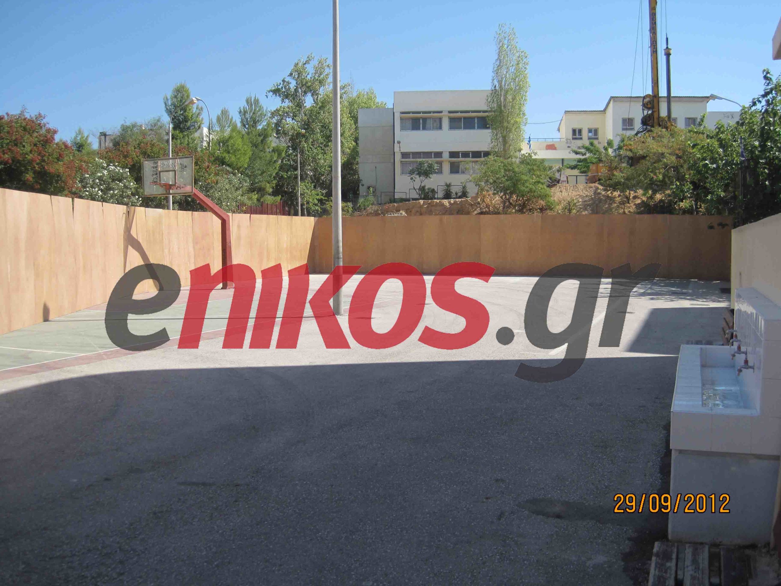 Μετά από όλα αυτά φτάνουμε και στο σημερινό θέαμα που αντίκρισα περνώντας από το σχολείο. Έχουν κλείσει τα 2/3 του προαυλίου αδιαφορώντας για τα «πρόβατα –μαθητές» με σκοπό πίσω από αυτή την πρόχειρη κατασκευή να μεταφέρουν τα μπάζα με τα φορτηγά τους και τις μπουλντόζες τους και όλα αυτά σε ώρα μαθήματος.