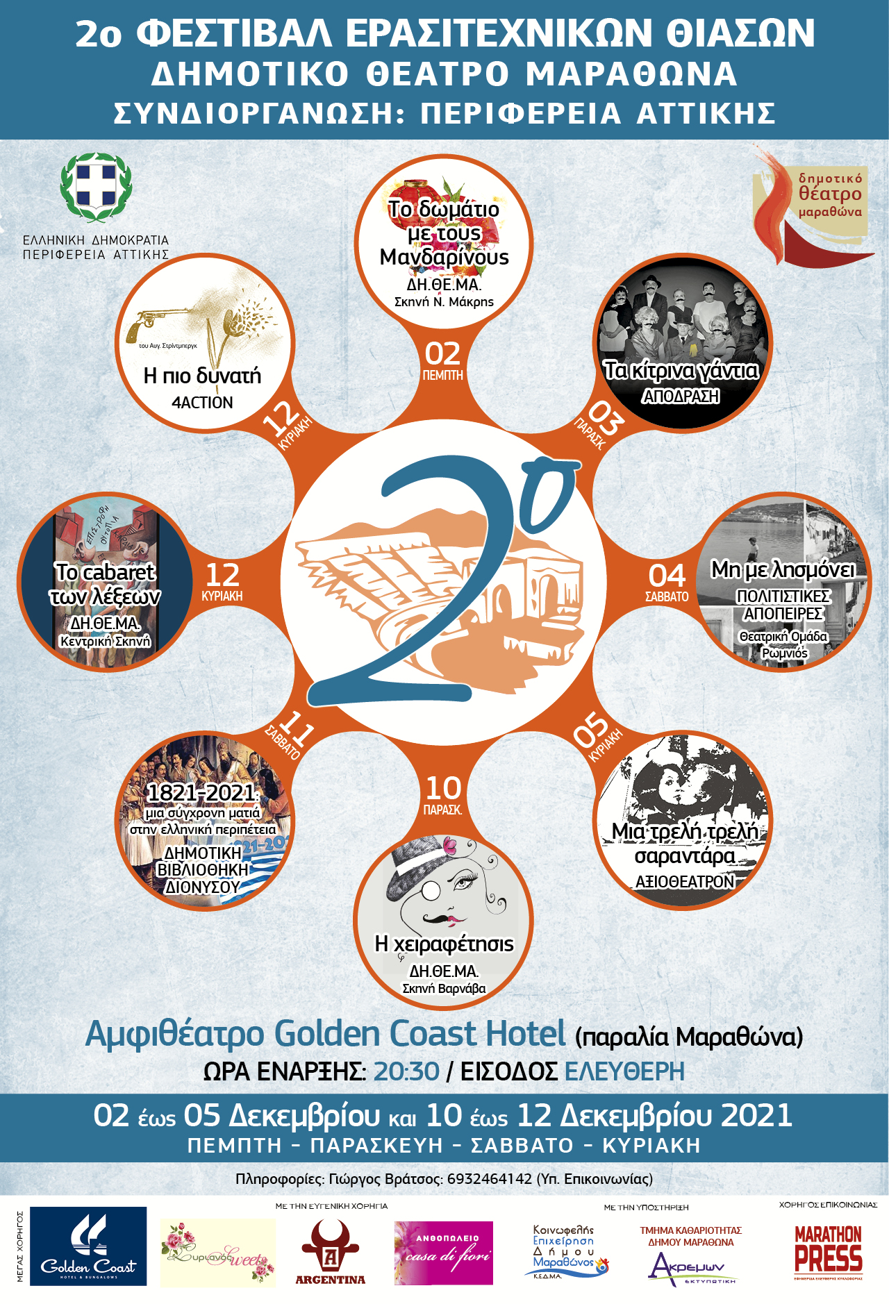 Το Φεστιβάλ, θα πραγματοποιηθεί από 2 έως 5 & από 10 έως 12 Δεκεμβρίου 2021 στο αμφιθέατρο του ξενοδοχείου Golden Coast στην Παραλία Μαραθώνα. Οι παραστάσεις θα ξεκινούν στις 8.30μμ.