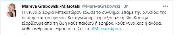 . Η σύζυγος του Πρωθυπουργού έγραψε στην ανάρτησή της: “Η γενναία Σοφία Μπεκατώρου έδωσε το σύνθημα: Σπάμε την αλυσίδα της σιωπής και του φόβου. Καταγγέλλουμε τη σεξουαλική βία. Και την εξορίζουμε από τη ζωή κάθε παιδιού ή εφήβου, κάθε γυναίκας ή άνδρα, κάθε ανθρώπου. Είμαι με τη Σοφία!”.
