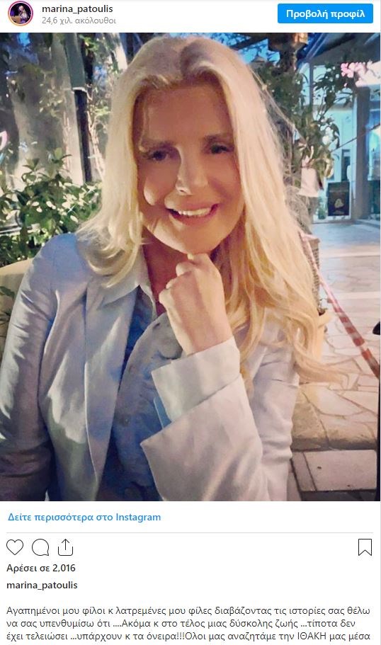 «Αγαπημένοι μου φίλοι και λατρεμένες μου φίλες διαβάζοντας τις ιστορίες σας θέλω να σας υπενθυμίσω ότι ακόμα και στο τέλος μιας δύσκολης ζωής, τίποτα δεν έχει τελειώσει… υπάρχουν και τα όνειρα!!! Όλοι μας αναζητάμε την ΙΘΑΚΗ μας μέσα από την προσωπική μας Οδύσσεια…!», έγραψε συγκεκριμένα.