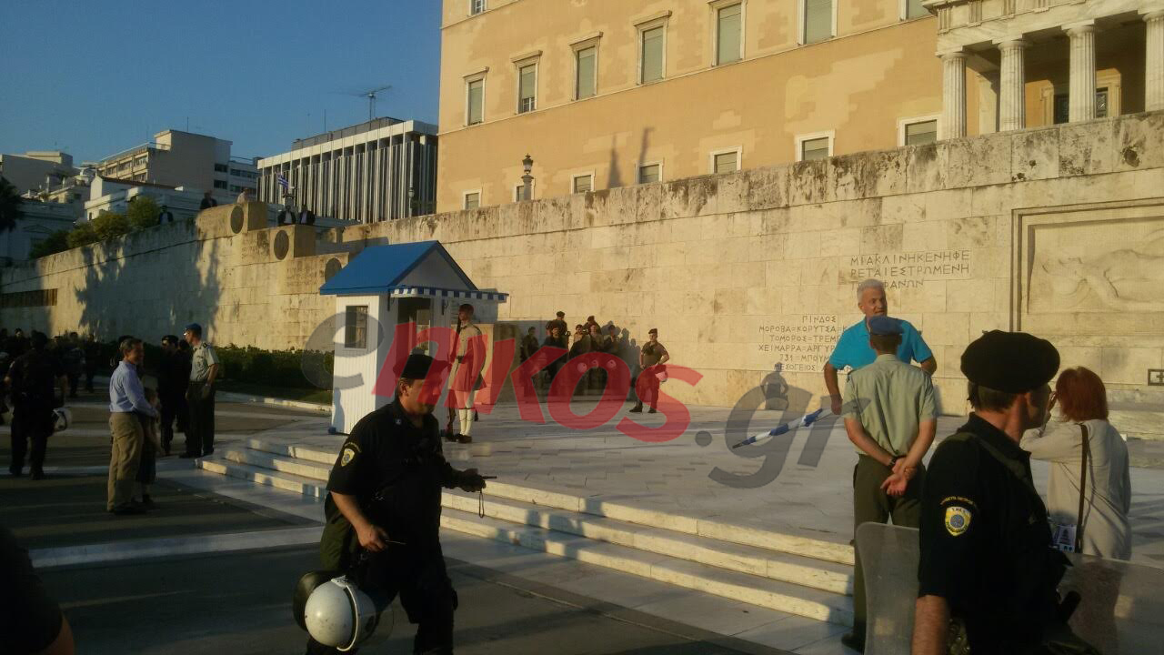 Διμοιρίες των ΜΑΤ βρίσκονται στις σκάλες που οδηγούν στο περιστύλιο της Βουλής. Κλειστή είναι αυτή την ώρα η Αμαλίας.
