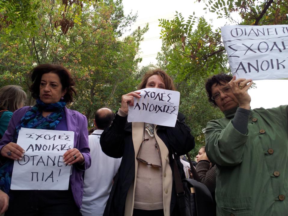 Μπροστά στην είσοδο της Φιλοσοφικής οι λιγοστοί φοιτητές που περιφρουρούσαν το λουκέτο αντιμετώπισαν τις αντιδράσεις των συμφοιτητών τους αλλά και καθηγητών. Βέβαια, υπήρχαν και πανεπιστημιακοί που επικρότησαν το λουκέτο, ενώ κάποιοι άλλοι δεν θέλησαν να πάρουν ευθέως θέση. Υπήρξαν και εκείνοι που βροντοφώναξαν «Σχολές ανοιχτές. Φτάνει πια»! όπως έγραφαν τα χαρτιά-αυτοσχέδια πανό από καθηγήτριες της σχολής. «Οφείλουμε να κάνουμε το μάθημά μας. Ας μην επιχειρηματολογούμε για τα αυτονόητα. Γι’ αυτό με πληρώνει το ελληνικό κράτος, για να είμαι σήμερα στη δουλειά μου» ανέφερε στην «Κ» η Μαρίζα Φουντοπούλου, πρόεδρος του Τμήματος Φιλοσοφίας – Παιδαγωγικής – Ψυχολογίας του ΕΚΠΑ. Η ίδια με τον επίκουρο καθηγητή του ίδιου Τμήματος Δημήτρη Φωτεινό έκαναν μάθημα σε περίπου 20 φοιτητές στον χώρο του πάρκινγκ της σχολής.