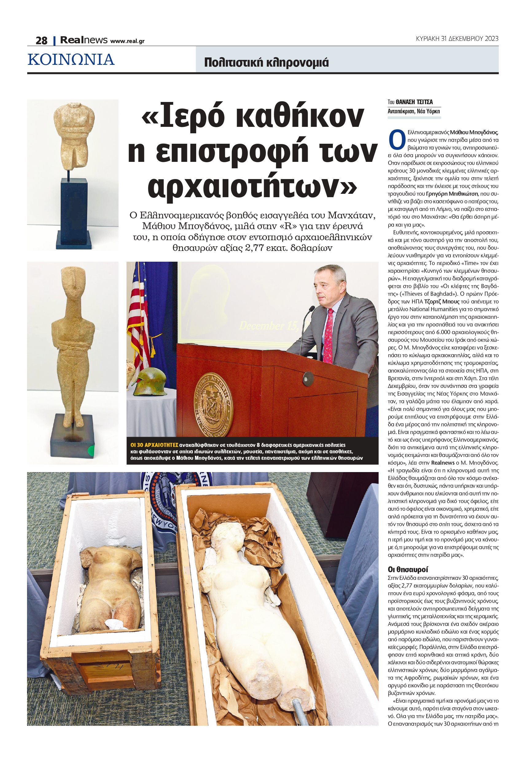 Ο Ελληνοαμερικανός βοηθός εισαγγελέα Μάθιου Μπογδάνος, που γνώρισε την πατρίδα μέσα από τα βιώματα τα γονιών του, αντιπροσωπεύει όλα όσα μπορούν να συγκινήσουν κάποιον. Όταν παρέδωσε σε εκπροσώπους του ελληνικού κράτους 30 μοναδικές κλεμμένες ελληνικές αρχαιότητες, ξεκίνησε την ομιλία του στην τελετή παράδοσης και την έκλεισε με τους στίχους του τραγουδιού του Γρηγόρη Μπιθικώτση, που συνήθιζε να βάζει στο κασετόφωνο ο πατέρας του, με καταγωγή από τη Λήμνο, να παίζει στο εστιατόριό του στο Μανχάταν: «Θα έρθει άσπρη μέρα και για μας».