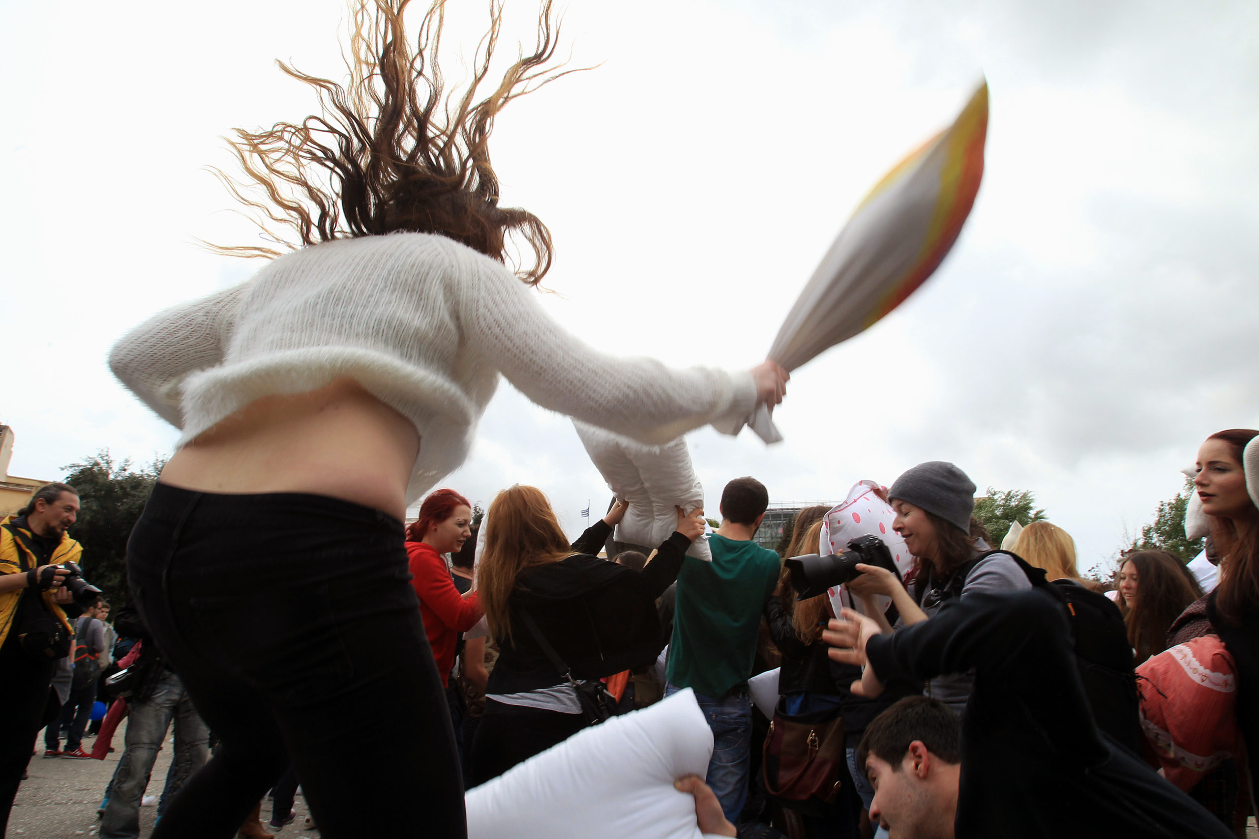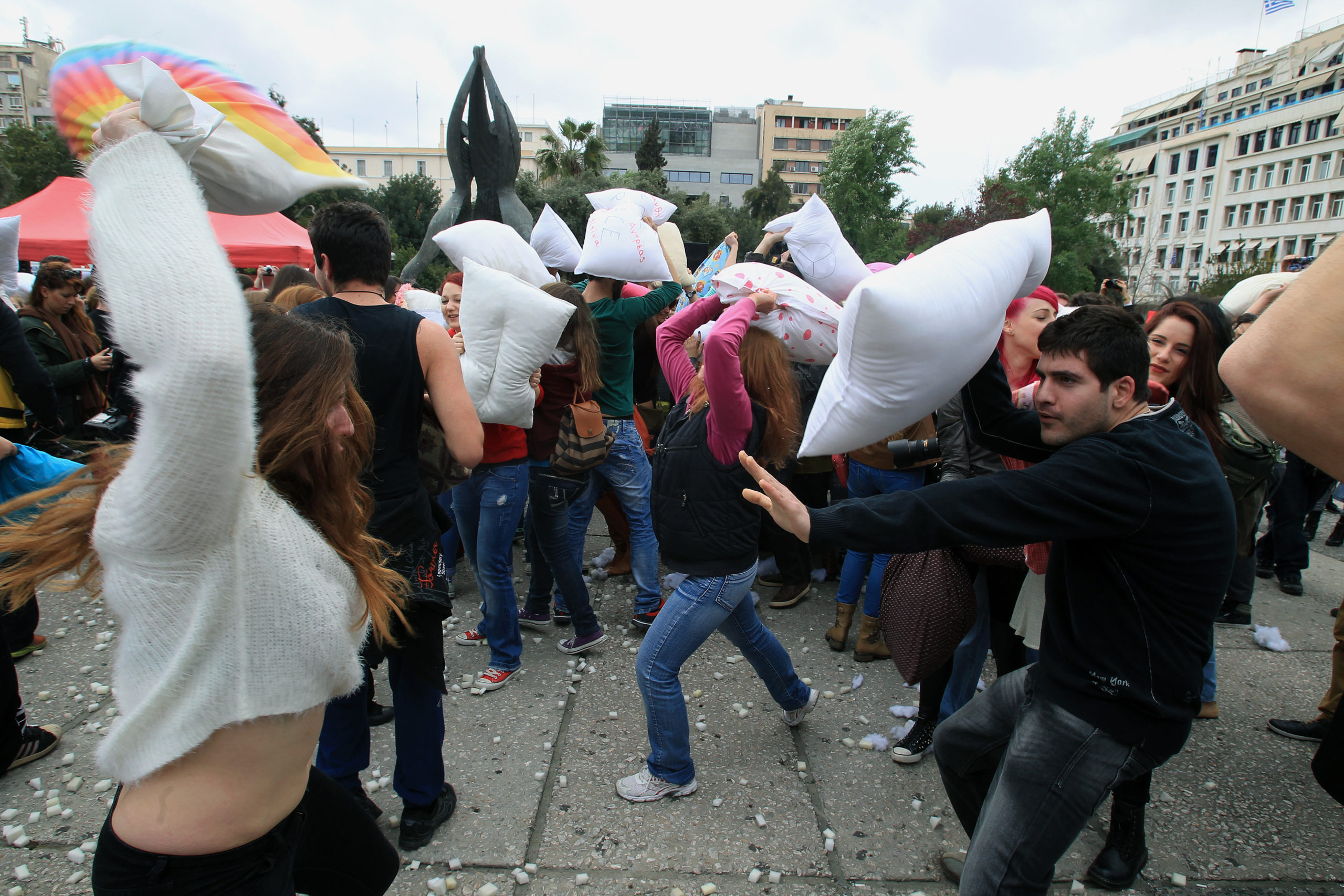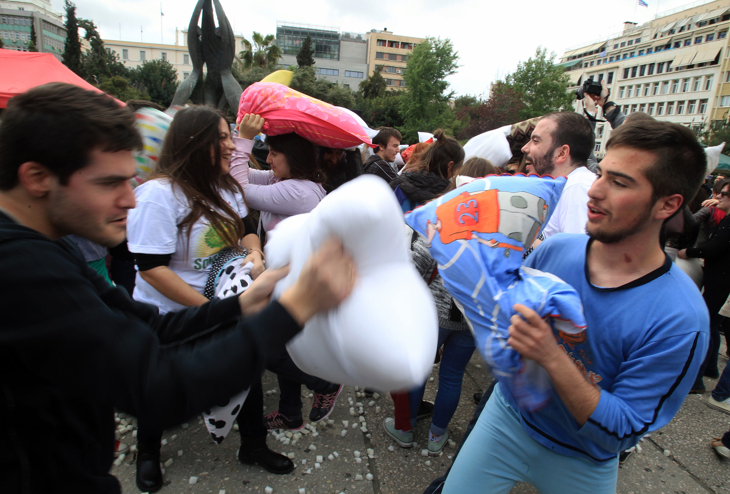 Μια πρωτότυπη «μάχη» με… μαξιλάρια, έδωσαν νέοι και νέες το μεσημέρι στην πλατεία Αριστοτέλους, στο πλαίσιο της «παγκόσμιας ημέρας μαξιλαροπόλεμου» και την ίδια ώρα με την παράλληλη διοργάνωση «μαξιλαροπόλεμου» στην Αθήνα, διασκεδάζοντας και στέλνοντας ταυτόχρονα μηνύματα μη βίας.