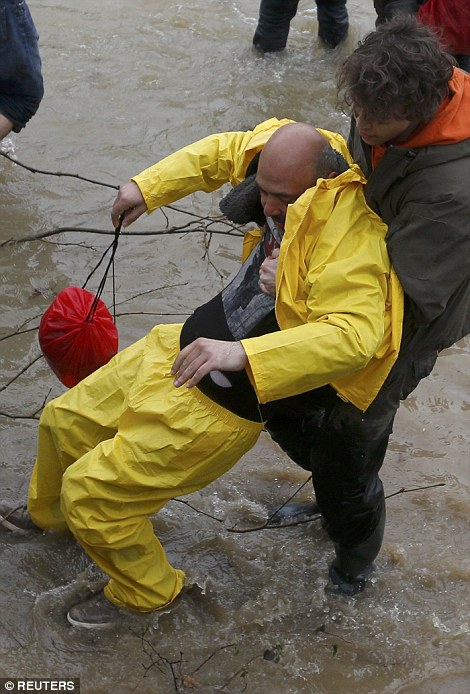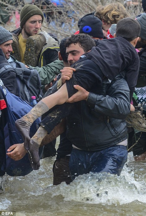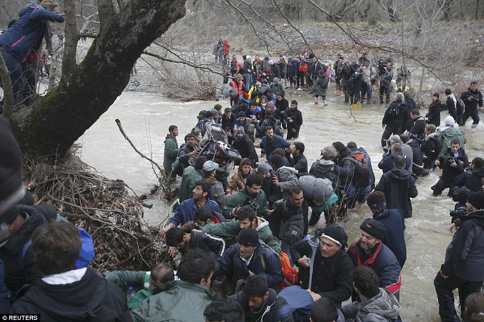 Άνθρωποι κάθε ηλικίας, με τα λιγοστά υπάρχοντά τους ανά χείρας περνούν μέσα από τα παγωμένα νερά προκειμένου να συνεχίσουν το ταξίδι τους προς τη βόρεια Ευρώπη, που είχε σταματήσει στην Ειδομένη, εδώ και αρκετές ημέρες.