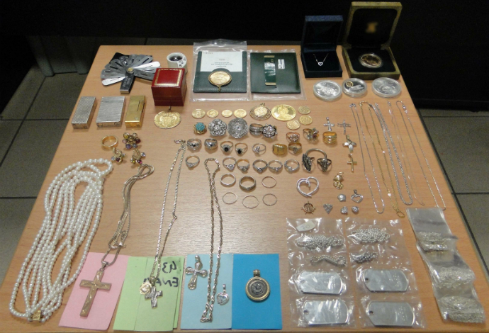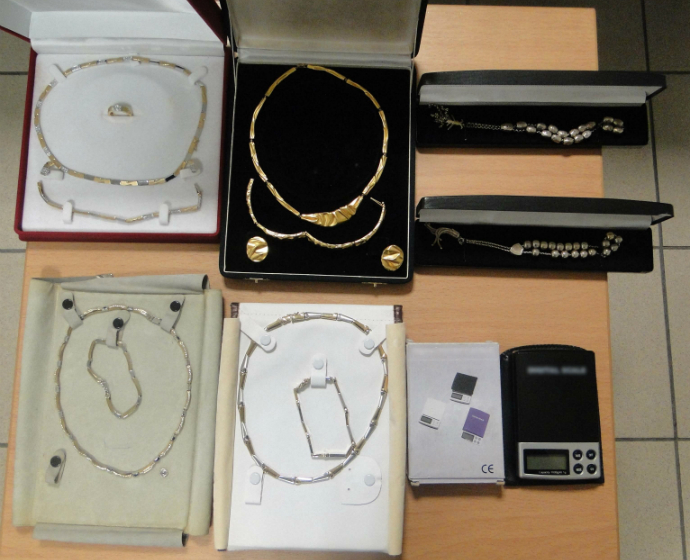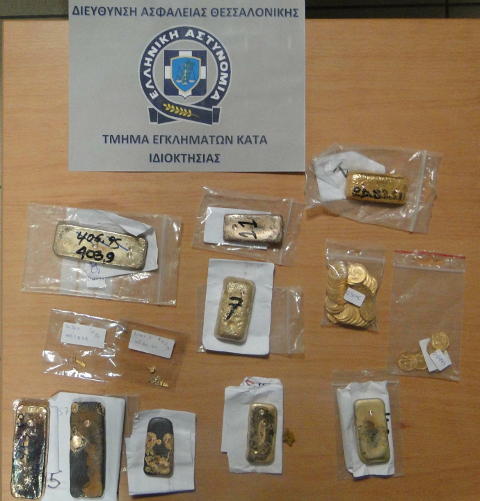 Αστυνομικοί εντόπισαν τον άντρα σε ενεχυροδανειστήριο, στο κέντρο της πόλης, να κατέχει εννιά πλάκες λιωμένου χρυσού, βάρους 3.596 γραμμάριων και αξίας 120.000 ευρώ, 49 χρυσές λίρες Αγγλίας, μία χρυσή λύρα τύπου “κοκοράκι” και δύο συσκευασίες με 2,5 γραμμάρια ρινίσματα χρυσού.