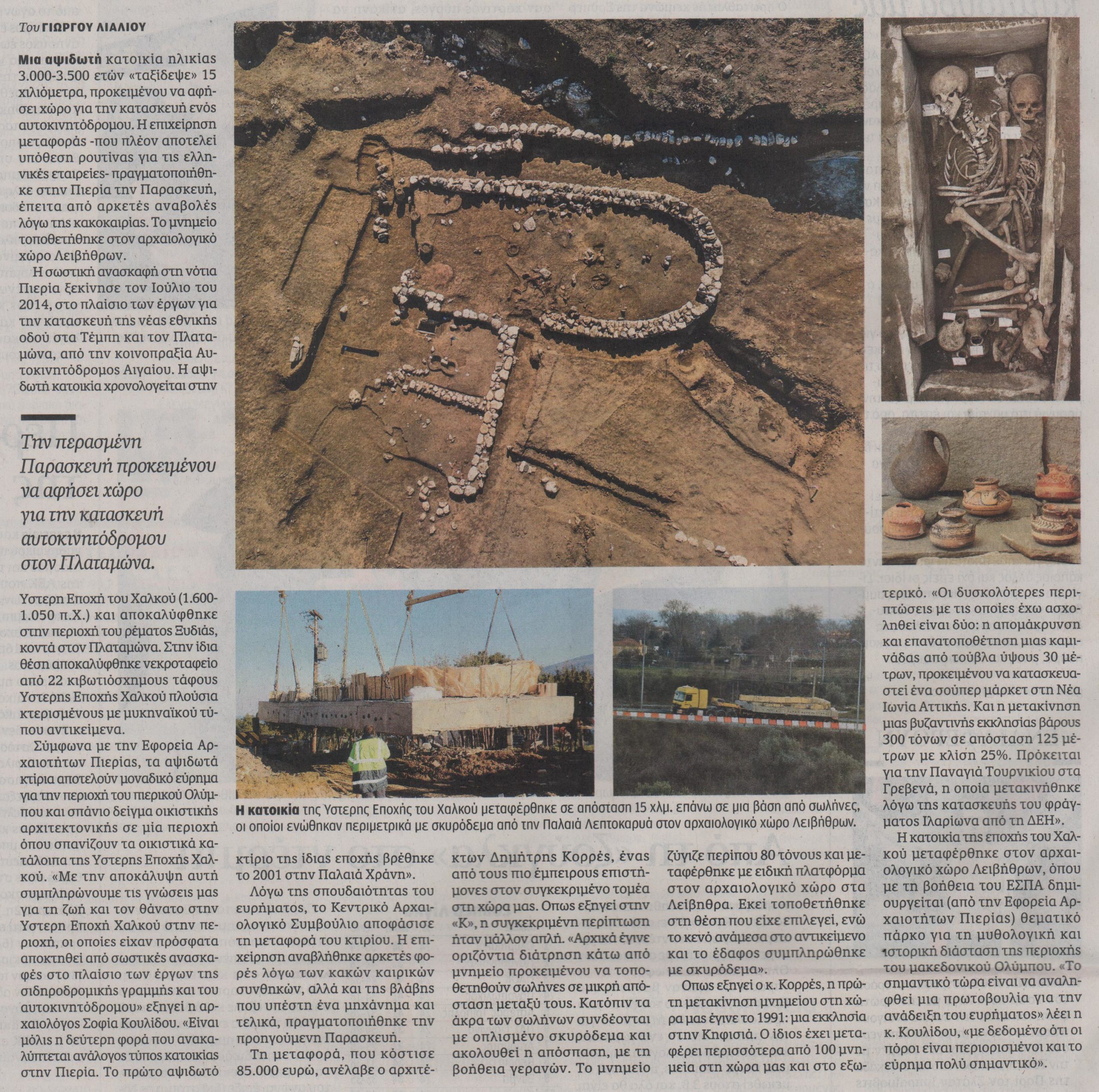 Μία αψιδωτή κατοικία ηλικίας 3.000-3.500 ετών «ταξίδεψε» 15 χιλιόμετρα, προκειμένου να αφήσει χώρο για την κατασκευή ενός αυτοκινητοδρόμου. Η επιχείρηση μεταφοράς –που πλέον αποτελεί υπόθεση ρουτίνας για τις ελληνικές εταιρείες- πραγματοποιήθηκε στην Πιερία την Παρασκευή, έπειτα από αρκετές αναβολές λόγω της κακοκαιρίας. Το μνημείο τοποθετήθηκε στον αρχαιολογικό χώρο Λειβήθρων.