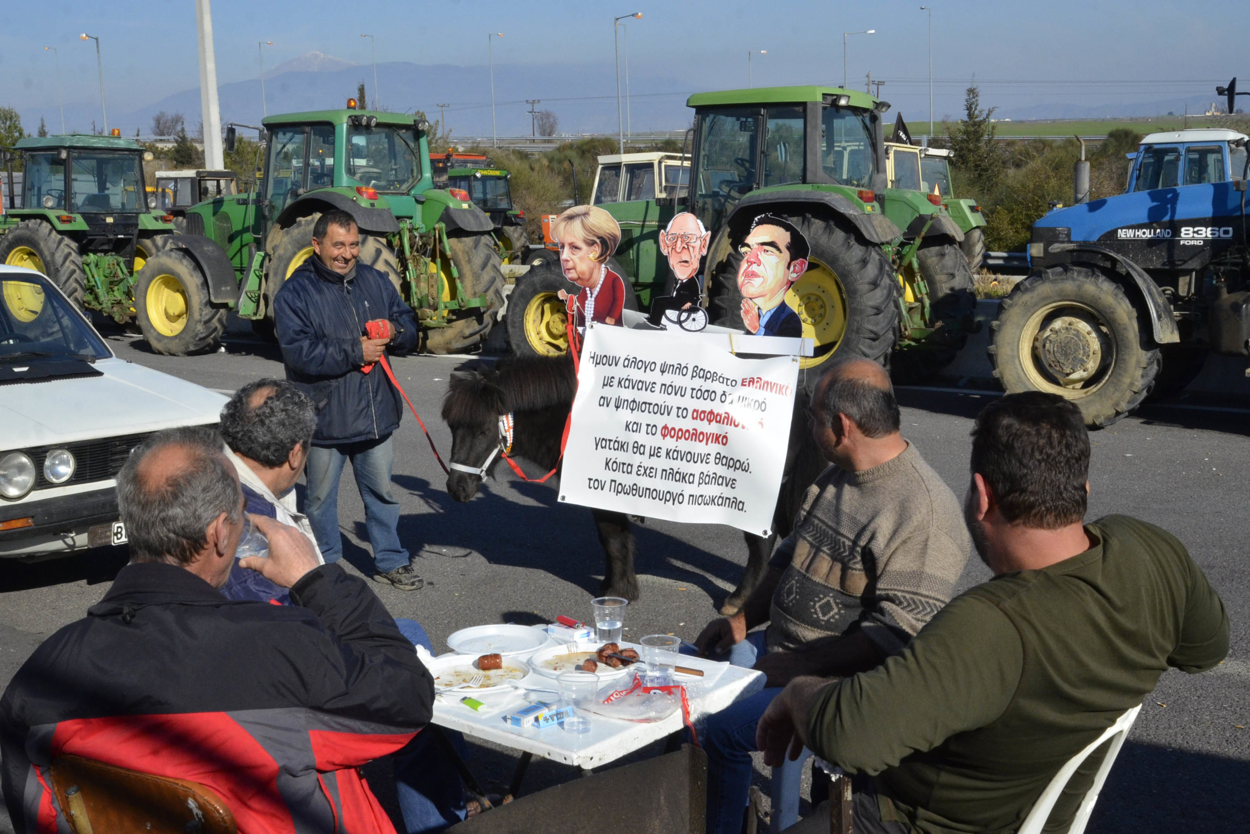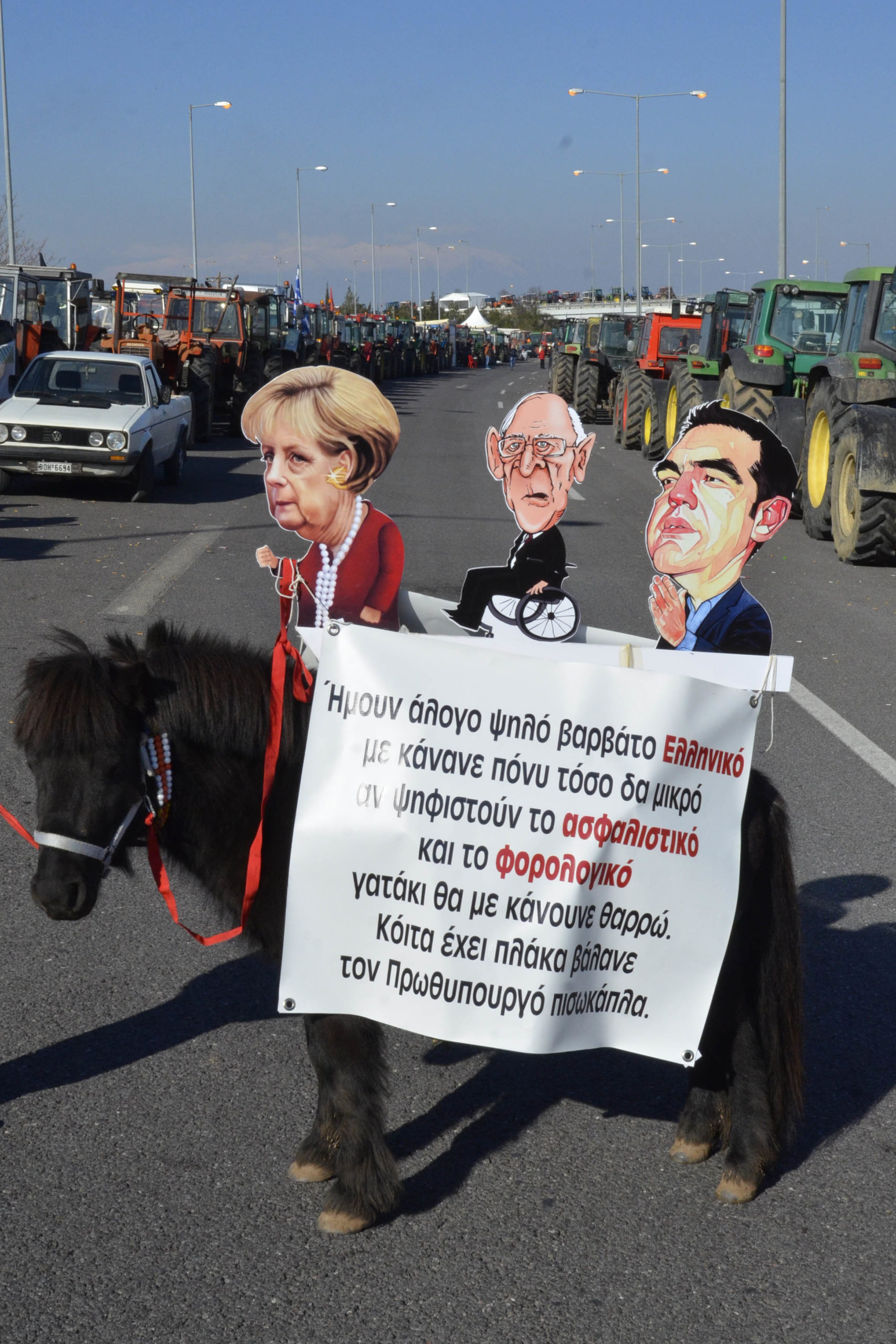 Σε εξέλιξη βρίσκονται οι κινητοποιήσεις των αγροτών στο μπλόκο της Νίκαιας, ωστόσο δεν χάνουν το χιούμορ τους και σατιρίζουν πολιτικά πρόσωπα. Οι αγρότες στην προσπάθεια τους να εκφράσουν την αντίθεση τους στο ασφαλιστικό και το φορολογικό, έφτιαξαν από χαρτόνι τα πρόσωπα της Γερμανίδας Καγκελαρίου, Άνγκελας Μέρκελ, του Γερμανού υπουργού Οικονομικών Βόλφγκανγκ Σόιμπλε και του Έλληνα Πρωθυπουργού, Αλέξη Τσίπρα και τα τοποθέτησαν πάνω σε ένα πόνυ.