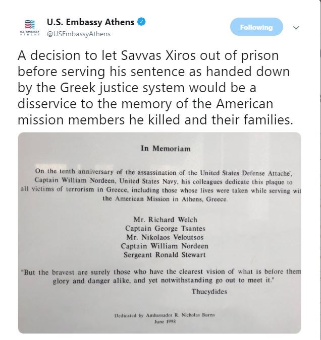 “Η απόφαση να αποφυλακιστεί ο Σάββας Ξηρός ενώ δεν έχει εκτίσει την ποινή όπως ορίστηκε από την ελληνική Δικαιοσύνη, θα ήταν ασέβεια στη μνήμη των μελών της αμερικανικής αποστολής, τα οποία εκείνος σκότωσε, και για τις οικογένειές τους” αναφέρεται στο σχόλιο της πρεσβείας στο twitter. Την ανάρτηση συνοδεύει η επιμνημόσυνη δέηση που είχε κάνει ο πρώην πρεσβευτής των ΗΠΑ τον Ιούνιο του 1998, όπου επικαλείται και μία ρήση του Θουκυδίδη.