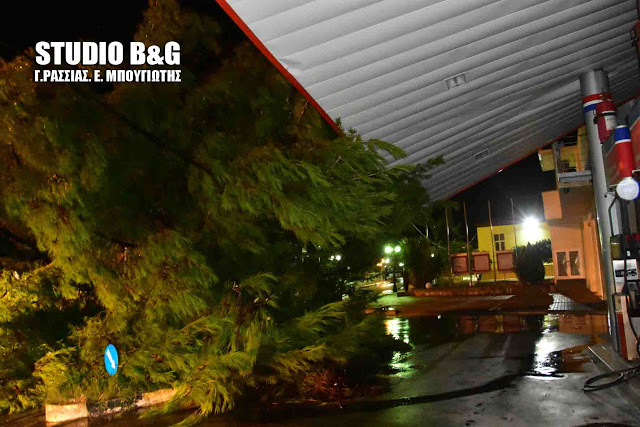 ‘Ένα τεράστιο πεύκο έπεσε από τον δυνατό αέρα της καταιγίδας πάνω σε πρατήριο υγρών καυσίμων στη Νέα Τίρυνθα.