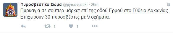 Σε εξέλιξη είναι αυτή την ώρα μεγάλη φωτιά που ξέσπασε στο Γύθειο, σε σούπερ μάρκετ. Σύμφωνα με την Πυροσβεστική, στο σημείο επιχειρούν 30 πυροσβέστες με 9 οχήματα.