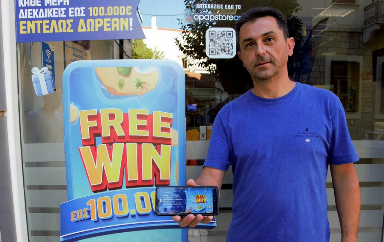 Ο υπεύθυνος του καταστήματος ΟΠΑΠ, Κώστας Μακαρούνης, περιγράφει τη στιγμή που ο παίκτης του FREEWIN κέρδισε το μεγάλο ποσό: «Ήταν απόγευμα Σαββάτου και ο πελάτης είχε έρθει να παίξει ΛΟΤΤΟ και ΤΖΟΚΕΡ. Πριν ετοιμάσει τα δελτία του, έβγαλε το κινητό και μπήκε στο OPAP Store App για να δοκιμάσει την τύχη του στο FREEWIN. Πρόσεξα πως κοιτούσε με μεγάλη προσήλωση την οθόνη του κινητού και πίστεψα πως απλώς διαβάζει κάποιο σημαντικό μήνυμα ή κάτι τέτοιο. Στην πραγματικότητα, εκείνη τη στιγμή, έπρεπε να αποφασίσει αν θα προχωρήσει στο επόμενο επίπεδο για τις 30.000 ευρώ και κατόπιν για τις 100.000!‘Ηρθε μπροστά στον πάγκο και γεμάτος αγωνία με ρώτησε “κέρδισα όντως 10.000 ευρώ; Μπορείς να δεις αν ισχύει;”. Μου ζήτησε να προχωρήσουμε στη διαδικασία της εξαργύρωσης, επιβεβαιώσαμε και τηλεφωνικά από τον ΟΠΑΠ πως τα χρήματα ήταν κατοχυρωμένα στον συγκεκριμένο αριθμό, φωτογραφήσαμε το στιγμιότυπο και αγκαλιαστήκαμε».