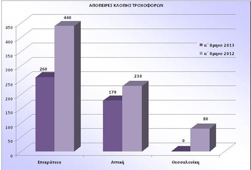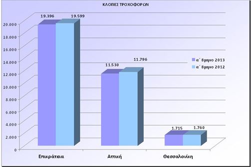 Συγκεκριμένα, σε επίπεδο επικράτειας, καθώς και στις περιοχές της Αττικής και Θεσσαλονίκης όπου εμφανίζεται ο κύριος όγκος των κλοπών τροχοφόρων, στη σύγκριση του οκταμήνου έτους 2013, σε σχέση με το οκτάμηνο του 2012, καταγράφονται σημαντικές μειώσεις σε αυτή την κατηγορία, ως εξής: