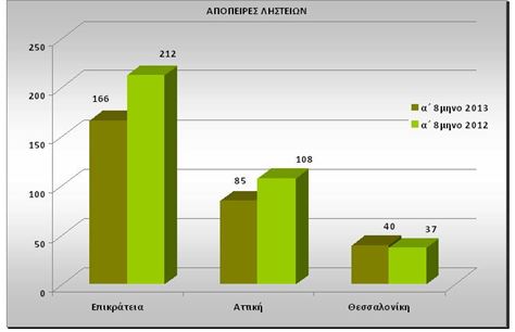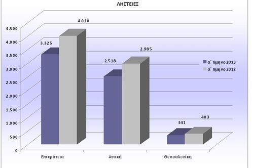 Συγκεκριμένα, σε επίπεδο επικράτειας, καθώς και στις πόλεις της Αθήνας και της Θεσσαλονίκης, όπου παρατηρείται ο κύριος όγκος των ληστειών, στη σύγκριση του πρώτου οκταμήνου του 2013 με το 2012, καταγράφονται:
