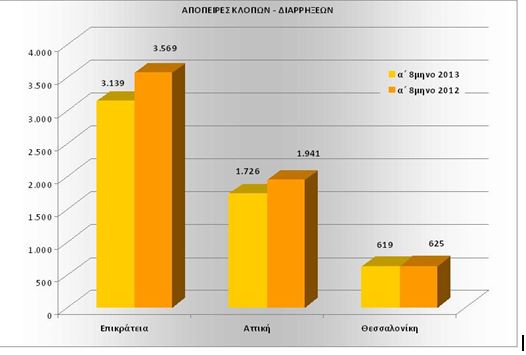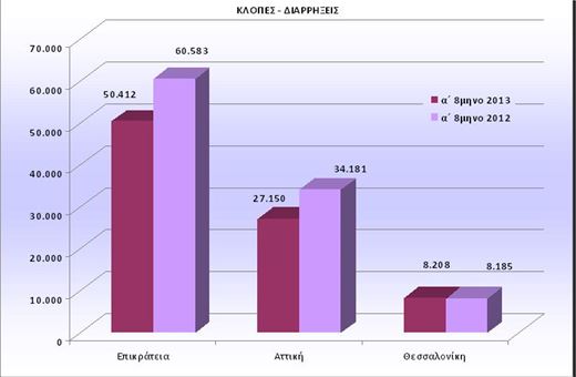 Το πρώτο οκτάμηνο του 2013, διαπράχθηκαν σε όλη την επικράτεια 50.412 κλοπές – διαρρήξεις, δηλαδή 10.171) λιγότερες, σε σχέση με το αντίστοιχο διάστημα 2012 (60.583). Επίσης, διαπράχθηκαν 3.139 απόπειρες κλοπών-διαρρήξεων έναντι 3.569, το 2012, δηλαδή 430 λιγότερες.