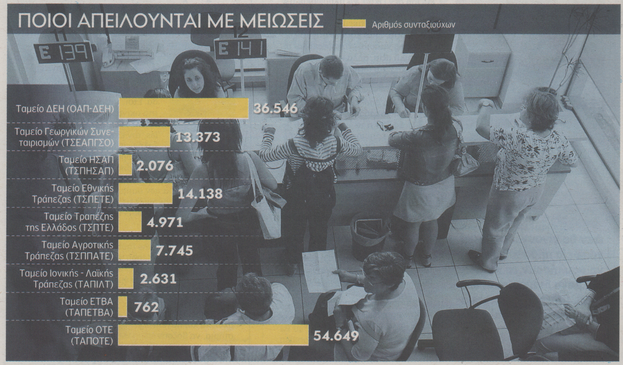 Επίμονα ζητά η τρόικα να ισχύσει στα ασφαλιστικά ταμεία των εργαζομένων στις ΔΕΚΟ και τις τράπεζες το μοντέλο του ΙΚΑ. Η μείωση των εισφορών, που επιδιώκει να πετύχει, θα δημιουργήσει κενό 100 εκατ. Η κάλυψή του θα απαιτήσει ψαλίδισμα των συντάξεων. Στη ζώνη των περικοπών βρίσκονται κατά πρώτο λόγο οι ασφαλισμένοι που οι συντάξεις τους υπερβαίνουν τα 1.000€.