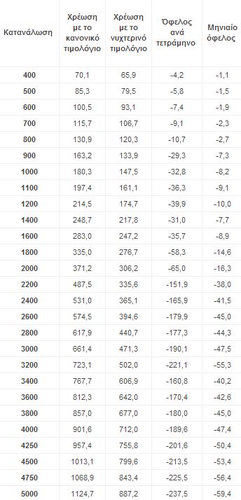 Για τον υπολογισμό του κόστους με το νυχτερινό τιμολόγιο, ελήφθη υπόψη ότι ο καταναλωτής θα καταφέρει να μεταφέρει στο «νυχτερινό» το 40% της συνολικής κατανάλωσης.